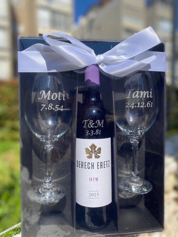 מארז זוג כוסות יין עם חריטה אישית + בקבוק יין